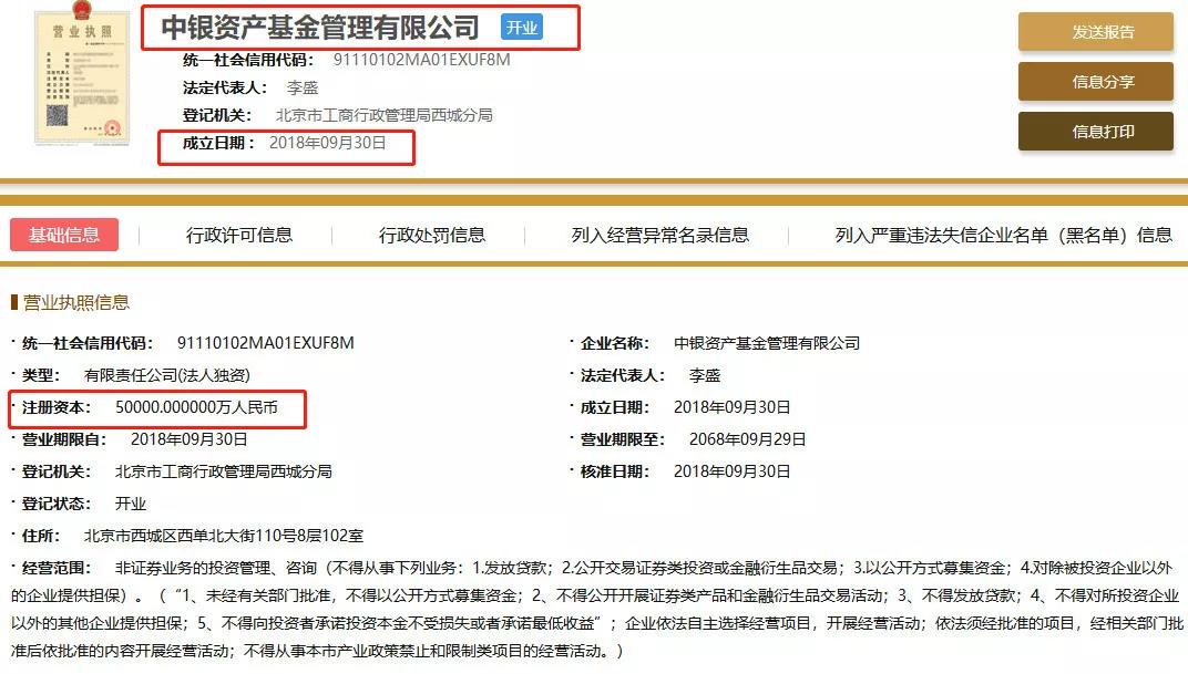 資料顯示,中銀資產(chǎn)基金成立于2018年9月30日,由中銀金融資產(chǎn)投資有限公司100%控股,注冊(cè)資本金為5億元,法定代表人為李盛。
